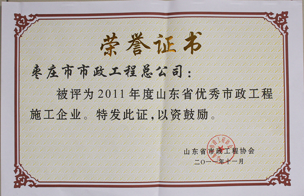 被山東省市政工程協(xié)會(huì)評(píng)為“2011年度山東省優(yōu)秀市政工程施工企業(yè)”