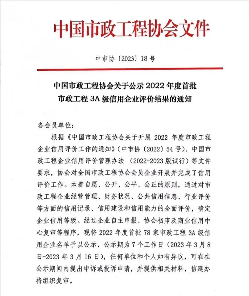 集團公司喜獲“2022年度市政工程3A級信用企業(yè)”